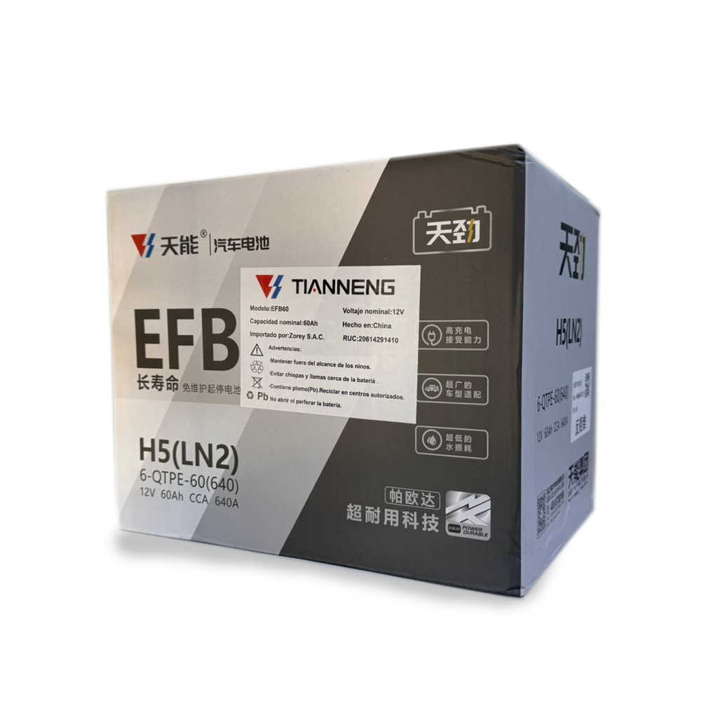 La Tianneng EFB 60AH (640 CCA) es una batería de tecnología avanzada diseñada para el parque automotor moderno en Perú, ideal para vehículos con sistema Start-Stop o aquellos que requieren un alto consumo eléctrico. Su tecnología EFB ofrece el doble de ciclos de vida que una SLI estándar, garantizando una mayor durabilidad ante las altas exigencias del tráfico urbano. Con 640 CCA, proporciona un encendido inmediato y confiable. Es la opción perfecta para quienes buscan la máxima resistencia y estabilidad de energía en un formato compacto (L2/LN2).